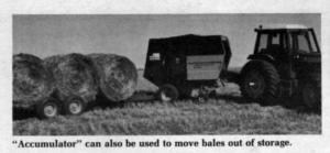 During the off-season, hitch your tractor to the Accumulator and it becomes a rear-loading and unloading transport to move bales previously laid down by the machine to headquarters, or to the feedlot.