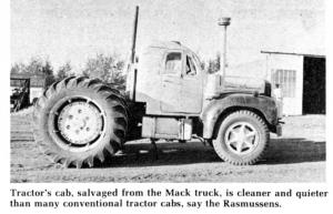 Homemade Tractor From A Mack Truck TRACTORS Conversions 6-2-9 Big tractors cost lots of money, unless you build your own like G. R. Rasmussen and his son, Brian, did in the workshop on their farm near Standard, Alberta, Canada. Their homemade 135 hp tractor started as a Mack truck and the rear end from a Euclid machine found in a scrap yard. It took one winter and about $3,500 to put the tractor together. "We've been using it for ten years and it's still going strong," says Brian.