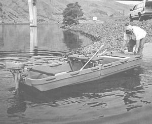 The 3-passenger, flat bottom boat measures 12 ft. long, 4 ft. wide, and 15 in. high and is hinged in the middle so it folds down to 6 ft. long and 30 in. high. It weighs 200 lbs. To use the boat you simply unfold it and place a seat over the hinge, using three sliding, lock action bolts to keep the hinge rigid.