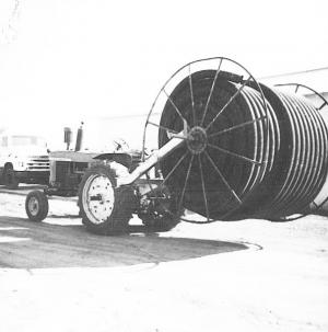 Prestin mounts the tile stringer on his Deere 4010 tractor. He buys 5- or 6-in. dia. plastic tile wound onto 10-ft. dia. reels.