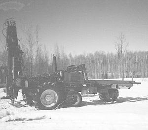 The pounder and drill are powered by a two-section, 60 gpm hydraulic pump mounted on back of the diesel engine. An-other pump mounted on the engine operates backward, forward and sideways tilt, as well as horizontal adjustment up to 5 ft. left or right.