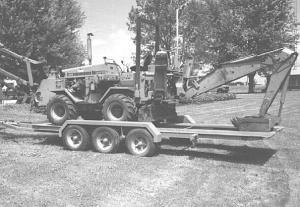 The trailer bed hinges on the pivot of the rear oscillating axles. It's just a couple inches off center so that gravity tips the trailer automatically when Roberts' Case 1845 Uni Loader passes the pivot point.