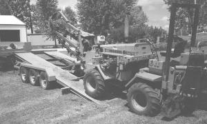 To use, he simply drives the loader up or down the 2-ft. wide ramps which tips it forward or backward on the pivot. When the loader is in place on the trailer, Roberts chains it down for transport.