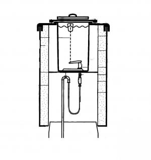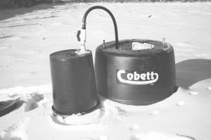 It consists of a plastic watering bucket that's partially buried below ground and is housed inside a 4-in. thick insulated donut-shaped housing that extends farther down into the ground. The housing rests on top of a ground heat tube that's located below the frost line.
