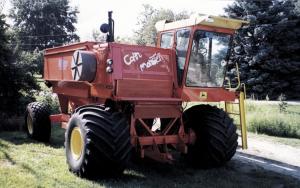 He says the "Corn Monster" works better than he ever dreamed it would. It's fitted with oversized flotation tires on front and back. He says visibility for unloading is outstanding thanks to the position of the cab on the left side of the machine. "I can see right into the truck when I unload so it's easy to spread the load around. It takes a lot of the stress out of harvest by making it easy and fun to haul grain," he notes. "The hydrostatic transmission makes it easy to operate."