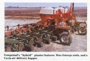 "We wanted air delivery for uniform planting speed, and the units for uniform seed placement," explains Gangestad. For his "hybrid", he substituted Max-Emerge planter units for the standard IH openers on his twoyear-old IH Cyclo 12-row planter. He also hinged the toolbar to fold hydraulically.