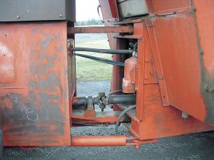 He reworked the two halves of the tractor so that the front and rear wheels are locked in a straight forward position. He also had to install a universal joint in the drive line and cylinders on each side of the pivot point.