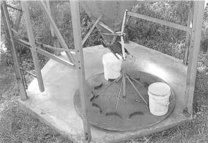 An 18-in. long piece of 1 1/8-in. dia. pipe extends about 1 in. above the concrete. A 1-in. dia. shaft on the bottom of the 4-ft. dia. turntable fits into it. Curved pieces of strap iron welded to the top of the turntable hold each bucket in place.