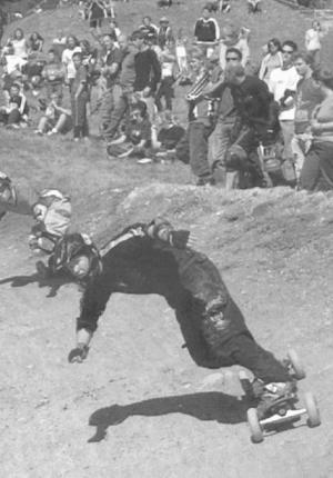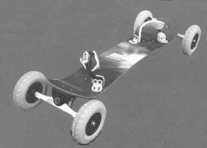 Off-road mountainboards, which look somewhat like snowboards, are popular in Europe and the company sells a variety of models. Equipped with 8-in. pneumatic wheels, the boards are able to negotiate rough dirt tracks. Your feet fit inside a pair of adjustable bindings.