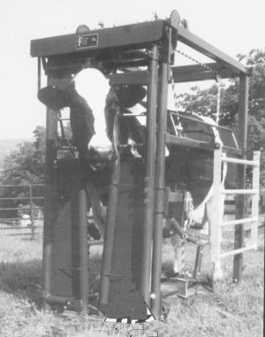 The Magno Chute is available with hydraulic "quad lift" which is a four-post frame design with hydraulic cylinders at each corner that are used to raise and lower the chute. Electric motors drive hydraulic pumps to power it. When the animal enters the chute, it's lifted by the hydraulically-operated belly band to take the weight off its feet. The chute comes with four manually-operated winches, one for each leg. The winch is used to lift each leg into an inverted "V". A toe board is used to put the hoof into position for trimming. The chute's sides are removable to allow access to the cow for clipping, fitting and vet work.