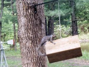 If you thought the economy is unstable, you should see my homemade "Bonkers" squirrel feeder in action. It's a hollow wooden box suspended by an 18-in. length of chain. When the squirrel jumps onto it the feeder bounces, twists, and turns. He gets the ride of his life and I get the fun of watching. All I add is four handfuls of sunflower seeds. It cost me $35 to make.