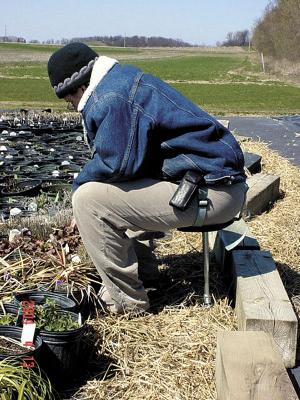 The one-legged stools reduce stress on the back, hamstrings and knees. The lightweight stools strap on to one's rear-end, and free up the hands when moving from spot to spot down the row. The device consists of a nylon waist strap, durable plastic seat, a metal leg that's adjustable to three different heights, and a 3 1/2-in. wide spring-like base that prevents the user from sinking into the dirt.