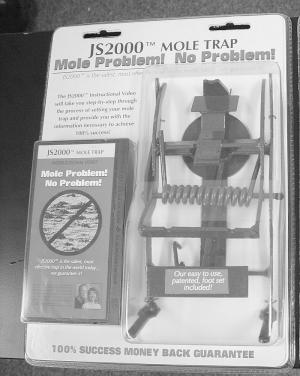They're so confident it will help you clear up your mole problems that they offer a 100 percent money-back guarantee on the trap-video combination. Of course, you can buy JS2000 traps without the video, but you'll not get the guarantee. The Schroedls have contracted with a manufacturer and are making the trap and video available to distributors and retail outlets.
