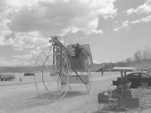 Thunder Thief, as Schneeveis calls it, travels about 10 mph and can cover 20 miles of pavement on one day's worth of sun. "The front wheel is 10 ft. in dia. and each back wheel is just over 5 ft. dia.," Schneeveis says. "My head is 14 1/2 ft. off the ground when I'm driving, so I can look over people's roofs when going down the street. The driver's seat is a saddle from a horse, and it has cable steering."