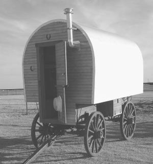 The sheepherders' wagons take a lot more work, she explains, although lower-end models are available for as little as $9,000. A recent wagon was custom designed for use at a Bed and Breakfast in Wyoming. It had a double bed on one end and benches on the side with a little chuck box and a heating stove.