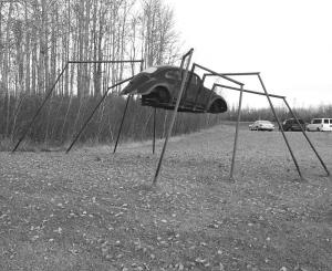 Four sections of heavy, 6-in. gas line pipe were welded to the underside of the car to provide the eight points from which the legs extend. The first vertical section of the legs are also made with the thick 6-in. pipe, while the next three sections used only 4-in. and 3-in. pipe, tapering down to the ground to give a more realistic look to the legs. All eight legs touch the ground, with each of them at different angles, so it looks like it's walking.