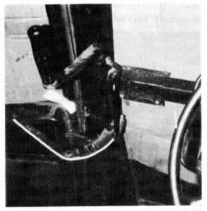 I made this "positive door control" for my 1486 IH tractor. It lets me open and close the cab door easily from the driver's seat and locks the door in the open position. Anyone who's ever been hit by the door when half-way in or out of the cab will appreciate this. (Emanuel Schlund, Rt. 3, Princeton, Ill. 61356 ph 815 894-2548)