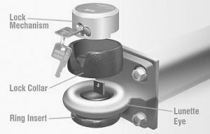 DaPlug consists of three pieces. The ring insert fits inside the lunette ring from the bottom. It mates with the lock collar, which slips into the top of the lunette ring. The lock mechanism fits inside the cast iron lock collar, protecting the mechanism from tampering. It comes in two models, one for 2 3/8-in. rings and one for 3-in. rings and sells for $69.95.