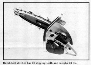 Called the "Ditcher", it's portable, lightweight (43 lbs.) and highly maneuverable in tight places. It digs a 21/z-in, wide trench for burying waterlines, gas lines, electric cables, telephone cables, etc. Another popular use is to dig out shrubbery and small trees for transplanting.
