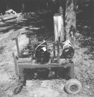 "I built a 5-gal. stainless steel gas tank for it and used two wheels from a riding mower on back and a couple caster wheels on front. It's pulled by a handle off a push mower and there's a fold-down hitch if you ever have to tow it with a garden tractor or ATV.