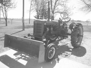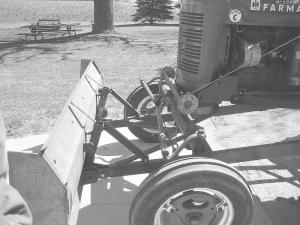 The 27-in. high, 3/16-in. thick blade was made from a piece of salvaged steel and has a 1-ft. long "wing" on each side to trap snow. It's controlled by a lever that was originally used to raise and lower a belly-mounted cultivator. A pair of cables run over pulleys on front of the tractor and are connected to a steel frame that supports the blade. The frame is made from 3-in. sq., 3/8-in. thick steel tubing and is welded to a cross brace that bolts onto the tractor frame just ahead of the rear axle. The blade connects to the frame with two steel pins, while the frame itself is held to the tractor by two more pins.