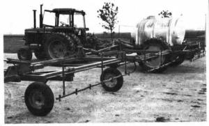 Allan Scott, who farms near Sargeant, used 2 by 6-in. 3/8-in. thick steel tubing to build the main frame and 4 by 4-in. steel tubing to build the cross members, then mounted a 1,000-gal. tank over an old semi truck axle. The tank and booms are carried by a pair of 38-in. tractor tires and six 6.7 by 15 in. gauge wheels.