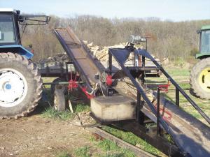 Tractor hydraulics run everything except the chainsaw and elevator, which are pto-driven. A right angle gearbox that comes off the pto is used to belt-drive the saw, which runs at 5,000 rpm's. Tractor hydraulics are used to tilt the saw up or down. As the saw tilts it releases tension on the drive belt to start or stop the saw.