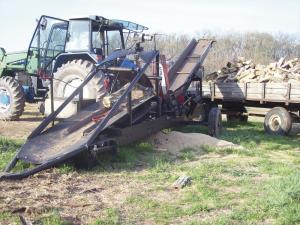 The section of cut log is dropped on a wood splitter where it's split into 6 pieces. The wood then falls onto an elevator that loads into a truck or wagon.