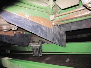 "The originals were flimsy, belt-style deflectors that wore out quickly and tended to break off at the metal mount that held them in place," says Petersen. "I made replacements out of high density plastic. They mount to the same bolts, but are longer with a fishtail end. The others wear out in about 1,000 acres. Mine have gone a thousand acres and show no wear."