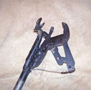 “The spring-loaded pliers at the bottom are attached to a cable that runs up through the conduit to a metal ring at the top. The pliers stay open until I pull on the ring. When I let go of the ring, the pliers automatically open back up. I also welded on an open-end wrench and a bent screwdriver. I use the pliers to pick up trash, the open-end wrench to dig out dandelions, and the screwdriver to pick up trash and also to dig out dandelions.”