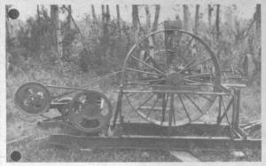 The splitter consists of a 5-ft. dia. front wheel off a 25-hp. steam engine. A large 7-lb. ax head is mounted on the outer edge of the wheel. The big splitting wheel is connected to a belt-drive pulley system that can either be hooked up to a motor or driven by a pto shaft.