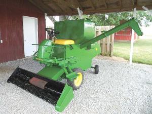 Gary Luthman’s half-scale combine looks like a mini John Deere 45 but works like a lawn mower. The 5-ft. header is fitted with three 21-in. reel mowers mounted side-by-side.