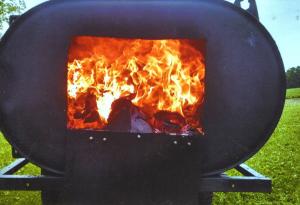 Smoke goes out a chimney that’s welded into a hole he cut into the other end of the barrel. It keeps rain out of the barrel and ashes in. There’s also a small vent at the bottom of the barrel with a screen over it. To clean out the ashes, Fetting removes the screen and then uses a homemade clean-out tool - that mounts on the side of the tank - to pull ashes out through the vent.