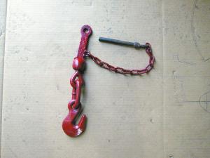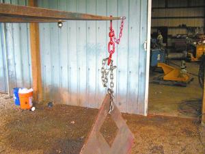 “To allow heavy loads to be rotated, carefully cut apart a chain binder, keeping the ball and socket-hook assembly. Weld one end of a short length of chain onto it and weld a 1/2 grade 5 or grade 8 bolt to the chain’s other end. Then run the top end of the assembly up through the hole in the fork and insert the bolt, which will allow the entire assembly to swivel.”