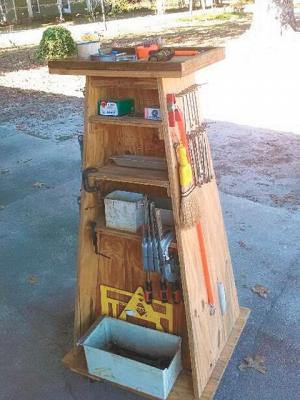 Hangers for the tools are 3 1/2-in. torx screws that were screwed through from the back side. Cheves used 5/8-in. plywood for the sides.