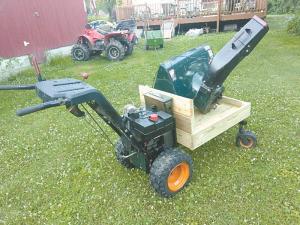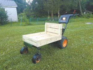 He started with an old Sears Craftsman 10/29 snowblower that he got for free. He unbolted the auger flighting from the snowblower frame keeping the rear axle, Tecumseh 10-hp. engine, and 6-speed hydrostatic transmission. He used 1-in. square tubing to weld together a frame that bolts on in place of the snowblower auger. It’s supported by a pair of caster wheels on the front. He then used 2 by 6 pressure-treated lumber to build a 4-ft. long, 2-ft. wide deck with 4-in. high sides and bolted it onto the frame. A channel iron bumper was installed on the front.