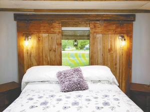 Lance Seltun repurposed a vintage hay mow barn door into a queen size headboard. He mounted it on the original track and attached it to a wall. The door is split in the middle and opens on rollers to reveal a window that would’ve been partially covered by a normal headboard.