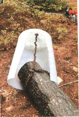 To use the cone, place a choker chain diagonally across the bottom of the cone and roll the log partially into the cone, then set the choker. Thread the end of the chain that goes to your 4-wheeler or tractor through the top of the barrel.