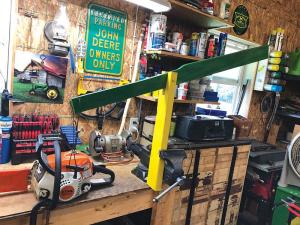 “To solve the problem, I made a wooden pump handle-type handle that pulls the rope. The saw’s pull cord handle slips through a length of cable attached to the end of the lever. I just push down on the handle to start the saw. I can crank with one hand and work the throttle and choke with the other. It provides the extra leverage I need and works great. I C-clamp the saw to my workbench.”