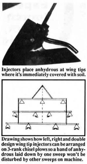 "We came up with the idea because we felt conventional knives and tubes allowed too much anhydrous to escape. Our injectors place anhydrous at the wing tips where it's immediately covered with soil. We get 95% or better efficiency, compared with only about 80% for injectors that place anhydrous behind the center of each sweep."