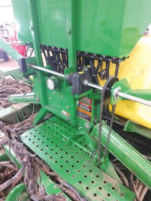 “I installed electric shutoffs on the uppermost cross shaft that drives the two rows of seed cups,” says Risch. “They are wired to the right and left shutoffs on the air drill to ensure the alfalfa seed shuts off when the air drill does.”