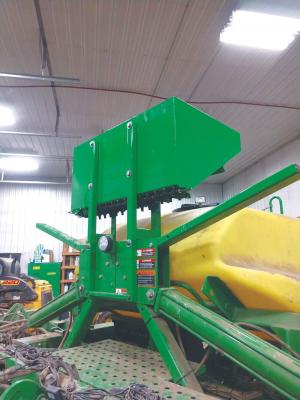 The seed box had to fit between the folding wings of the 30-ft. air drill and over the OEM seed tank without impacting existing wiring and hoses. This limited its size and shape. Risch designed it to taper over the large OEM seed tank that is behind it on the air drill.