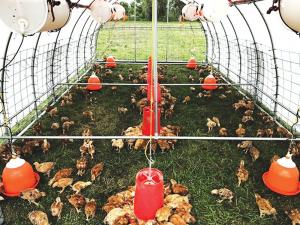 “I wanted to have all waterers and feeders hung from the interior of the roof for ease of movement, so I cut short sections of pipe to install above the purlin side straps and hold 30-gal. drums of water,” says Harrold. “Bell drinkers and feeders were also hung from the ceiling and the drums gravity feed the water. I also installed a four-way manifold system to connect a garden hose for refilling the barrels from a portable IBC tote using a generator and pump.”