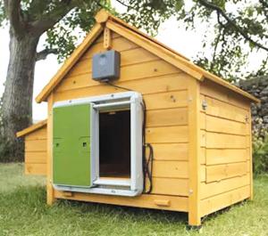 A small weatherproof control box with a light sensor allows the door to open and close according to natural light levels. However, it can be programmed to open and close at set times.