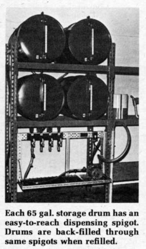 Handiest system we've seen for storing and dispensing lubricants is the Chief Storage Center, from Sauk Valley Equipment Co., Rock Falls, Ill. It lets you store from 4 to 36 speciallybuilt 65 gal. storage drums, each equipped with a dispensing spigot, on a permanent wall rack.