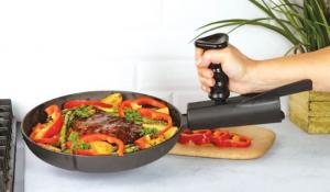 The Pan Buddy is made of high-quality, heat-resistant materials and is dishwasher-safe. Sells for $19.99 plus S&H at the KitchInventions website. It has a design patent and other patents pending.