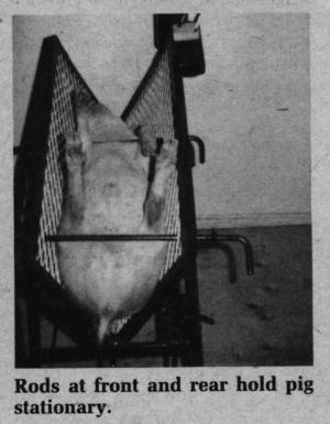 Three sizes are available to handle pigs up to 40 lbs., to 70 lbs., and a large model for hogs weighing up to 185 lbs. The two smaller models sell for $99.50 (Canadian). The larger model, which has its own stand, sells for $185.00.