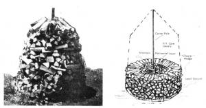 A Holzhaufen as high as 10' will stand as long as the wood will hold up, and - within a period of three months - will probably shrink to about 8'. This shrinkage will continue as moisture is lost from the wood. Thus, the center indicator pole can be used as a measure of dryness. When the Holzhaufen has shrunk between 20 to 25%, the wood is ready to be brought in and burned.