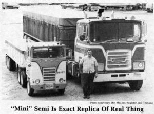 Mini Semi Is Exact Replica Of Real Thing FARM HOME Toys/Games 2-4-20 "It's something I always wanted to do," says Jim Cowell, McGregor, Iowa, who handbuilt a "mini" semi truck and trailer to 114 scale. The only difference between it and a regular rig is its size. It's licensed and insured to drive on the highway, and is the headline attraction in a dozen or more parades every year.