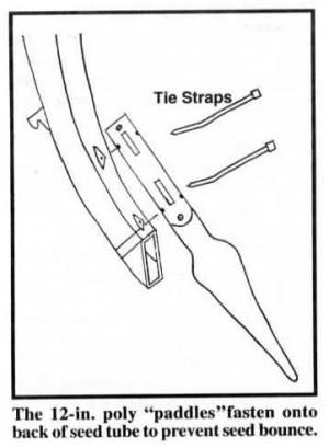 It consists of a 12-in. long curved poly "paddle" that fastens onto the back of the seed tube with two nylon tie straps. As seed comes out of the tube, it's "trapped" in the bottom of the trench by the plastic strip which has a concave depression in the center of it.